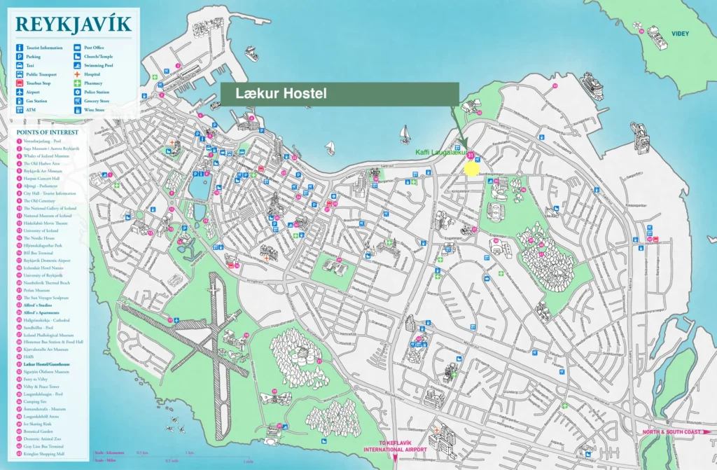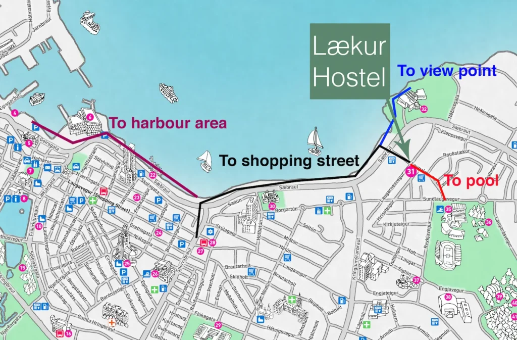 The family-owned Lækur hostel and guesthouse is located 2km away from the city centre at address Laugarnesvegur 74a. The location has a nice neighbourhood and friendly feel yet it is very central. Only a few steps away from Laugardalur, the green river valley of the city.